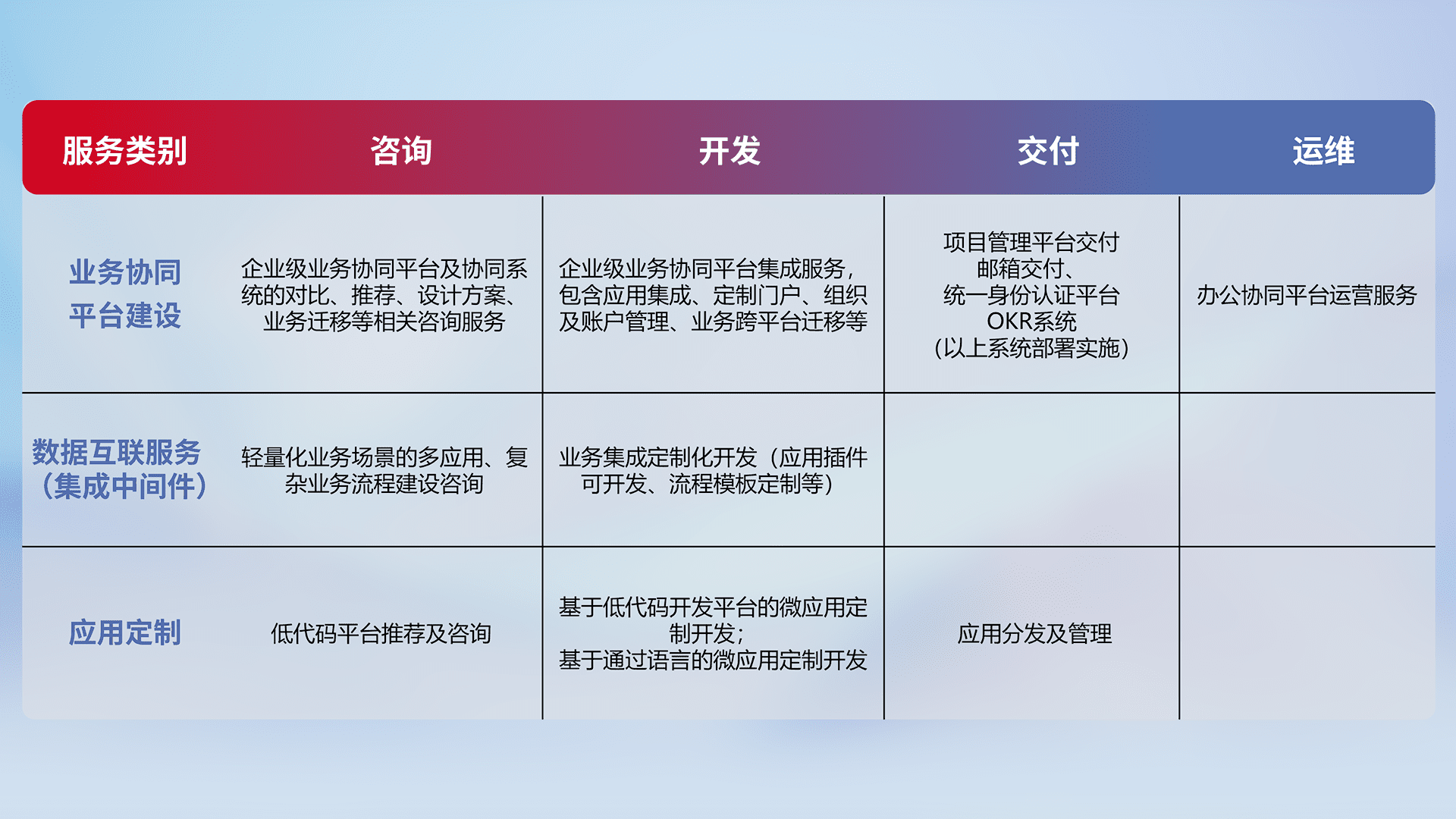 针对钉钉、、企微、、、IDaas等平台级产品提供产品的规划、、、、方案、、交付、、定制化开发等服务,,实现如统一协同办公、、智能客户服务、、、混合会议管理、、、智能数据查询、、、、等业务场景,,,实现数字化转型。。。。