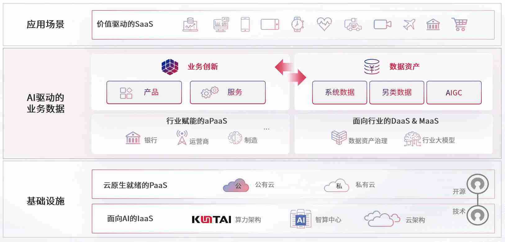 数字时代,,,,围绕企业数字化转型的关键要素,,,,www.kaiyun.com数码开创性的提出数云融合战略和技术体系框架,,,着力在云原生、、、数字原生、、、、AI原生和信创产业上架构产品和服务能力,,,,为处在不同数字化转型阶段的快消零售、、汽车、、、、金融、、医疗、、政企、、、、教育、、运营商等行业客户提供泛在的敏捷IT能力和融合的数据驱动能力,,,,构建跨界融合创新的数字业务场景和新业务模式,,,,助力企业级客户建立面向未来的核心能力和竞争优势,,全面推动社会的数字化、、智能化转型升级。。。。