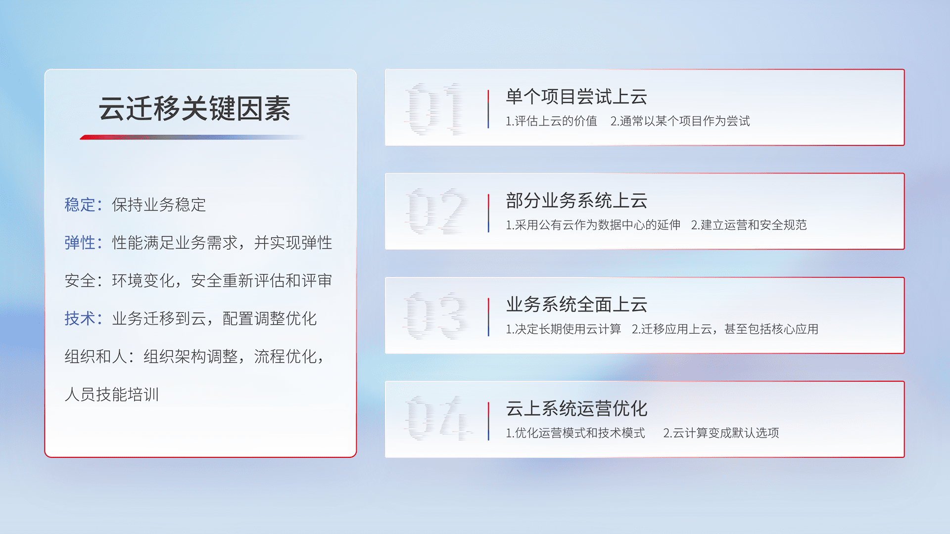 结合实际业务,,,,从规划设计、、云平台选型、、、、云原生改造、、、、数据迁移、、、、集成交付,,,迁移全过程为客户识别最佳上云路径,,,做好风险识别管理,,,,设计网络架构、、、身份权限、、、、安全审计合规、、、操作审计、、、日志审计、、监控告警策略、、、多站点容灾设计等,,,,对云上基础设施进行整体规划,,提升IT治理水平,,以满足弹性、、高可用、、、高性能的需求。。