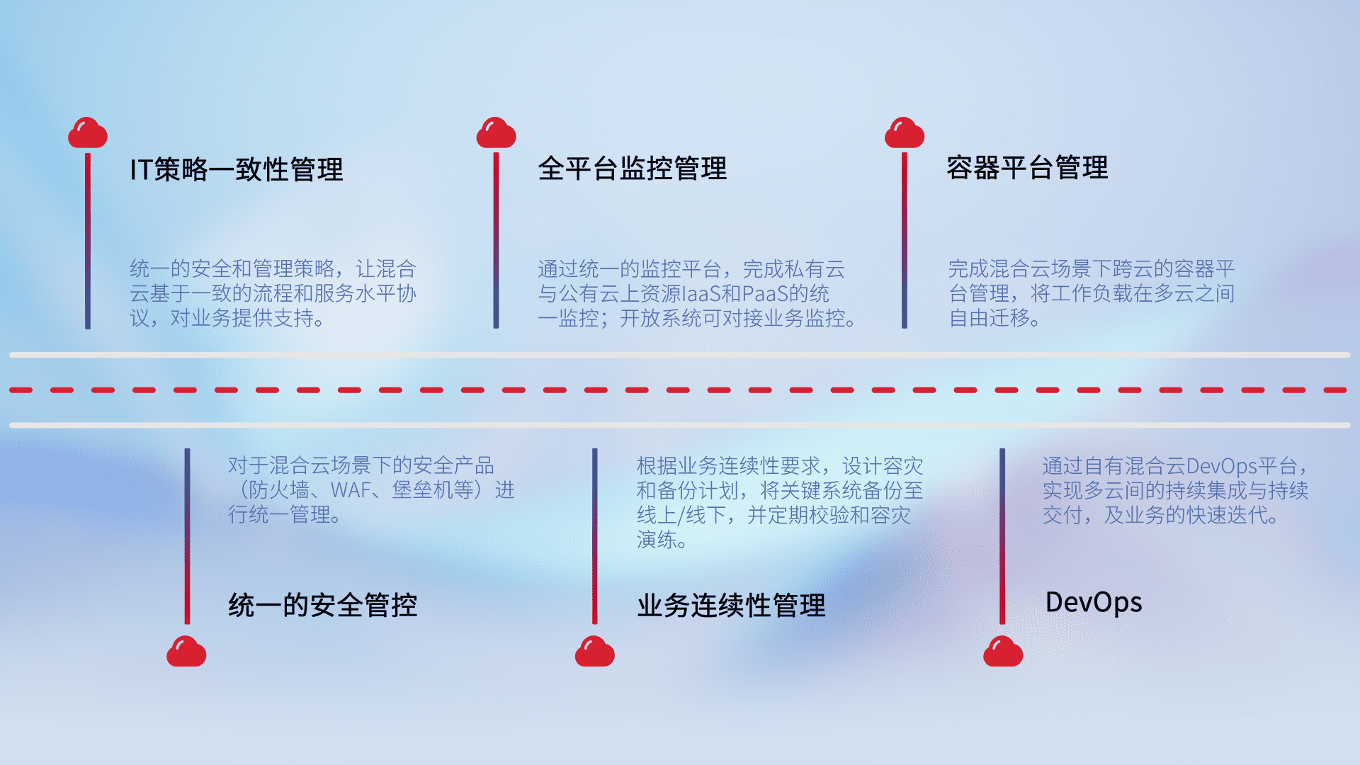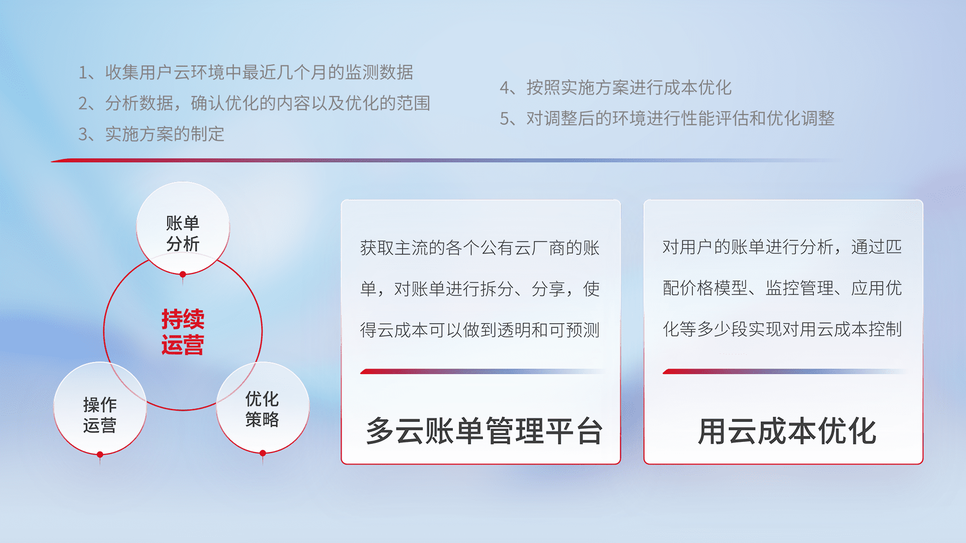 通过多云纳管,,以统一的资源数据模型把客户的云资源进行抽象和封装,,,,进而实现对多云资源的统一操作,,,,保障云资源管理的可靠性、、、、稳定性与可用性。。量身定制化运维内容,,,配置、、、、开发运维、、补丁管理、、、、备份、、、、监控、、认证和访问管理、、、、审计和日常巡检等,,,保障在用云过程中的可靠度,,稳定度以及高可用率。。。。